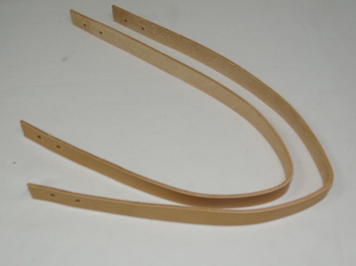 Een set bestaat uit 2 repen tuigleer van 2 cm breed en 54 cm lang, de dikte is ongeveer 2,5 á 3 mm dik. Aan de uiteinden zijn 2 gaten aangebracht waarmee de hengsels aan de tas bevestigd kunnen worden. De hengsels worden veel gebruikt voor gehaakte of gebreide tassen.Ook voor de tassen gemaakt met raffia.(zoals op de foto)