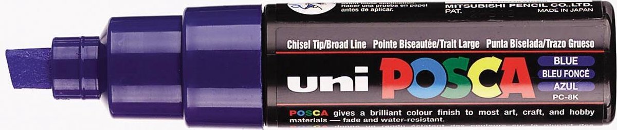 Merkstift op waterbasis en gepigmenteerde inkt. Schrijfbreedte: 8 mm. Ideaal om te schilderen, tekenen, schrijven en markeren op elk oppervlak. Met ondoorlatende, heldere kleuren. Dekkend, overschrijfbaar, mengbaar, waterbestendig, constant bij langdurigeblootstelling aan licht en reukloos. Geschikt voor alle ondergronden. Permanent op poreuze oppervlakken.\\n\\ndonkerblauw