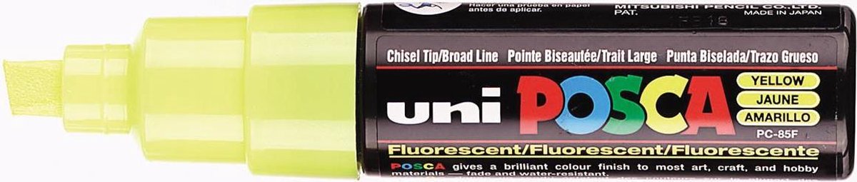Merkstift op waterbasis en gepigmenteerde inkt. Schrijfbreedte: 8 mm. Ideaal om te schilderen, tekenen, schrijven en markeren op elk oppervlak. Met ondoorlatende, heldere kleuren. Dekkend, overschrijfbaar, mengbaar, waterbestendig, constant bij langdurigeblootstelling aan licht en reukloos. Geschikt voor alle ondergronden. Permanent op poreuze oppervlakken.\\n\\nfluo geel