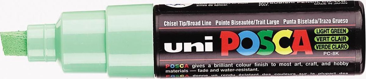 Merkstift op waterbasis en gepigmenteerde inkt. Schrijfbreedte: 8 mm. Ideaal om te schilderen, tekenen, schrijven en markeren op elk oppervlak. Met ondoorlatende, heldere kleuren. Dekkend, overschrijfbaar, mengbaar, waterbestendig, constant bij langdurigeblootstelling aan licht en reukloos. Geschikt voor alle ondergronden. Permanent op poreuze oppervlakken.\\n\\nlichtgroen