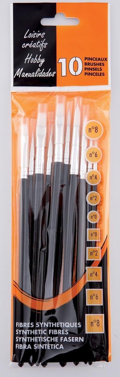Synthetische vezels. Set van 5 ronde (nr 0, 2, 4, 6, 8) en 5 platte penselen (nr 0, 2, 4, 6, 8). Korte steel, zwart gelakt.