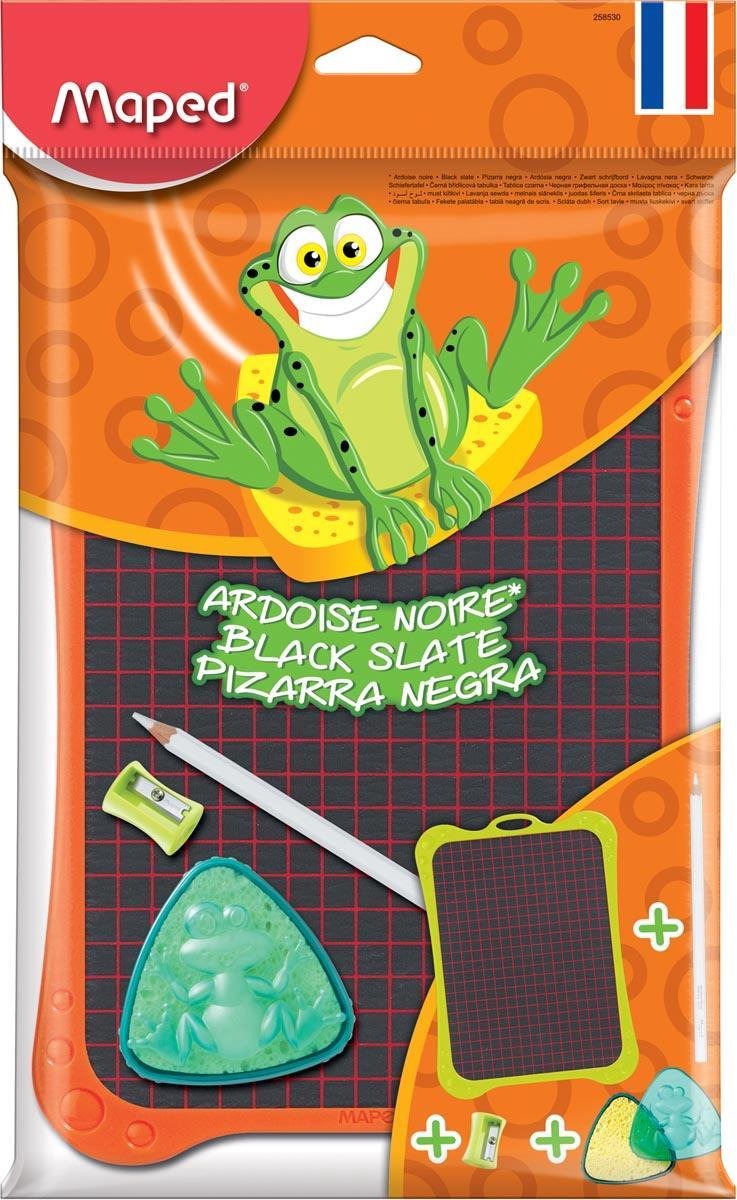 Een zijde om te tekenen, een zijde om te schrijven. De accessoirehouder kan dienen als staander voor de lei. Met plastic kader. Inclusief sponsje, krijtpotlood en potloodslijper. In geassorteerde kleuren: groen en oranje.