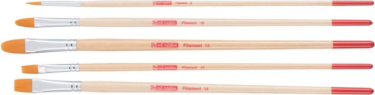 Uit polyester. Voor olieverf, acrylverf en plakkaatverf.\\n\\nset van 5 stuks: 1 x rond nr 6, 2 x kattentong nr 10 en 14 en 2 x plat nr 10 en 14