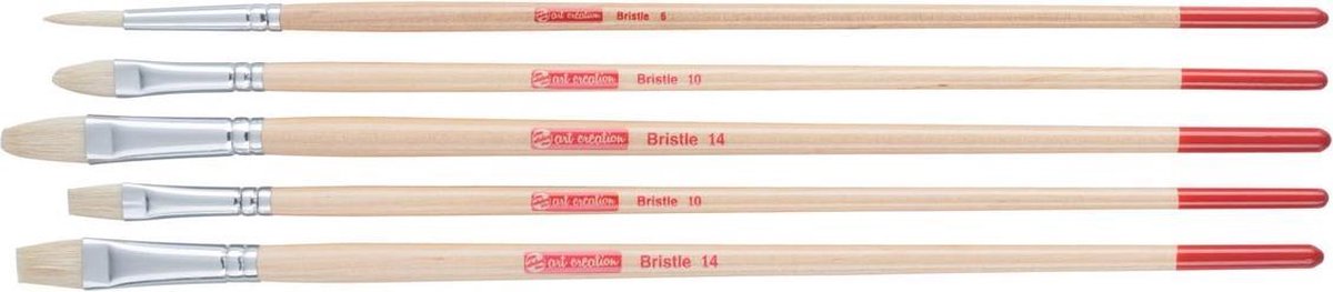 Uit varkenshaar. Voor olieverf, acrylverf en plakkaatverf.\\n\\nset van 5 stuks: 1 x rond nr 6, 2 x kattentong nr 10 en 14 en 2 x plat nr 10 en 14