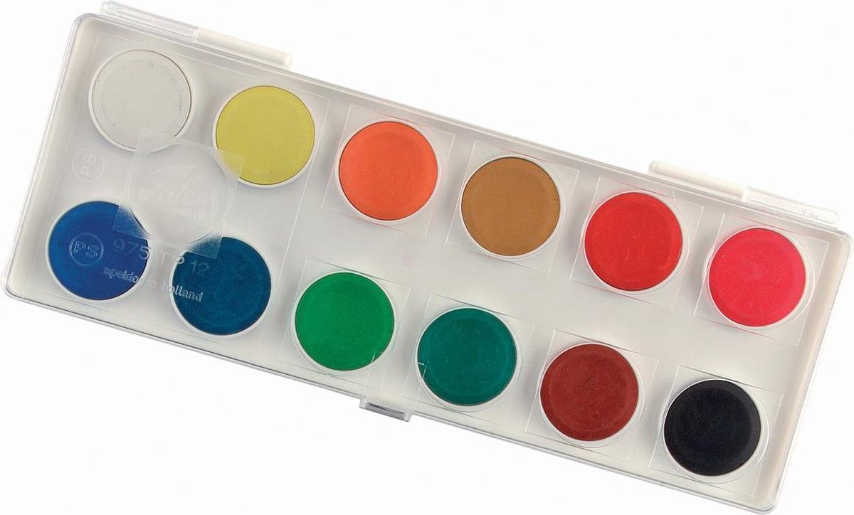 Geeft volle dekkende kleuren. Kleuren zijn uitstekend onderling mengbaar. Voor gebruik op school en thuis. Plastic doos met 12 napjes in geassorteerde kleuren.