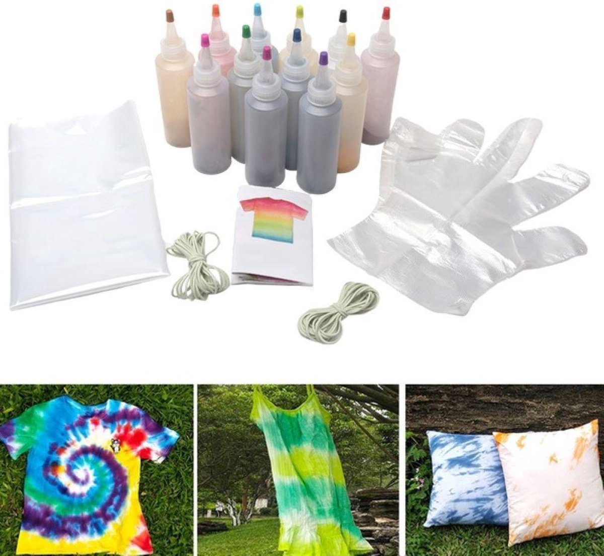12 Kleuren Tie Dye Kit, Complete Tie Dye Set van 12 kleuren Met deze 12 kleuren kunt u vele verschillende soorten creaties maken. Maak een geweldige tas, shirt, sokken of nog veel meer leuks! Ook super leuk om kinderfeestjes mee op te leuken! Genoeg voor ongeveer 40-60 projecten. Pakket omvat: 12x kleurstoffen 40x elastiekjes 8x wegwerp handschoenen 1x tafelkleed 1x handleiding Vul de flesjes tot het zwarte streepje en schud goed. De verf kun je na gebruik goed bewaren. Na verloop van tijd kan de kleur iets afzwakken. Maak het shirt of ander tie-dye project nat voor gebruik, dit zorgt er voor dat de verf makkelijker intrekt (niet te nat maken). Bind het shirt of ander gewenst tie-dye project bij elkaar en spuit het verf op het project. Wees hier vooral royaal anders zul je veel wit zien. Stop het tie-dye project in een dichte zak en laat 6 uur zitten. Spoel het project goed uit. Was het tie-dye project hierna in de wasmachine, zodat de verf die niet gehecht heeft, weg kan spoelen.