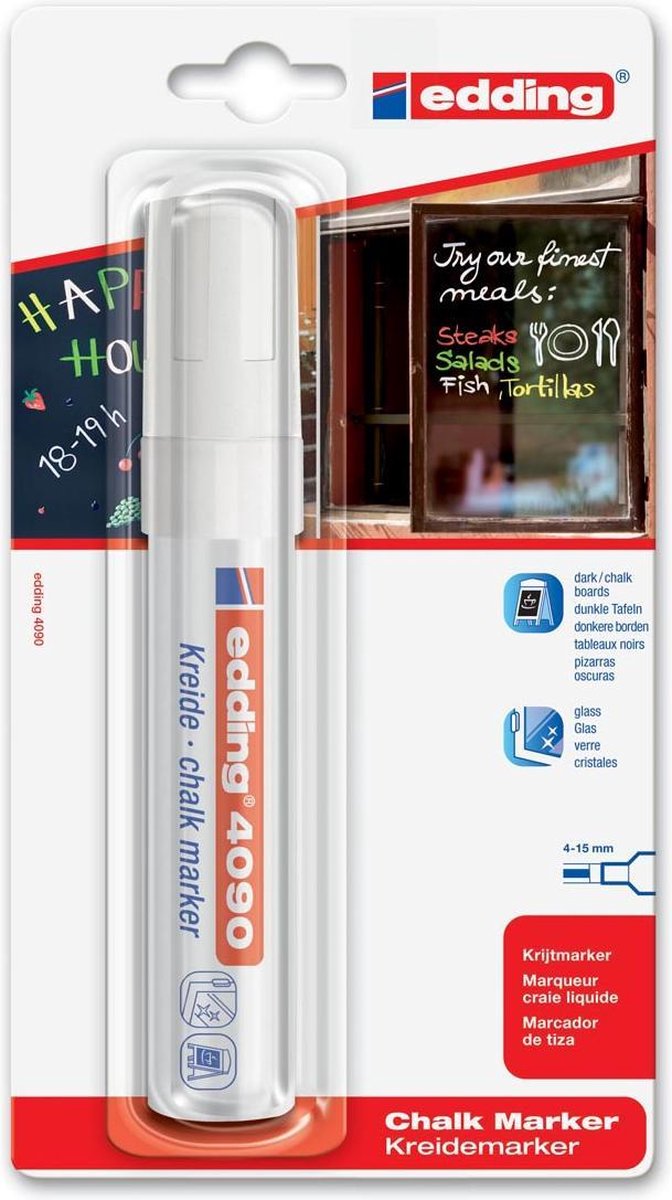 Beitelvormige punt. Schrijfbreedte: 4 - 15 mm. Geurneutraal krijt op waterbasis. Voor het beschrijven van o.a. ramen en deuren. Met een vochtige doek te verwijderen van bijna alle niet-poreuze oppervlakken.\\n\\nwit, op blister