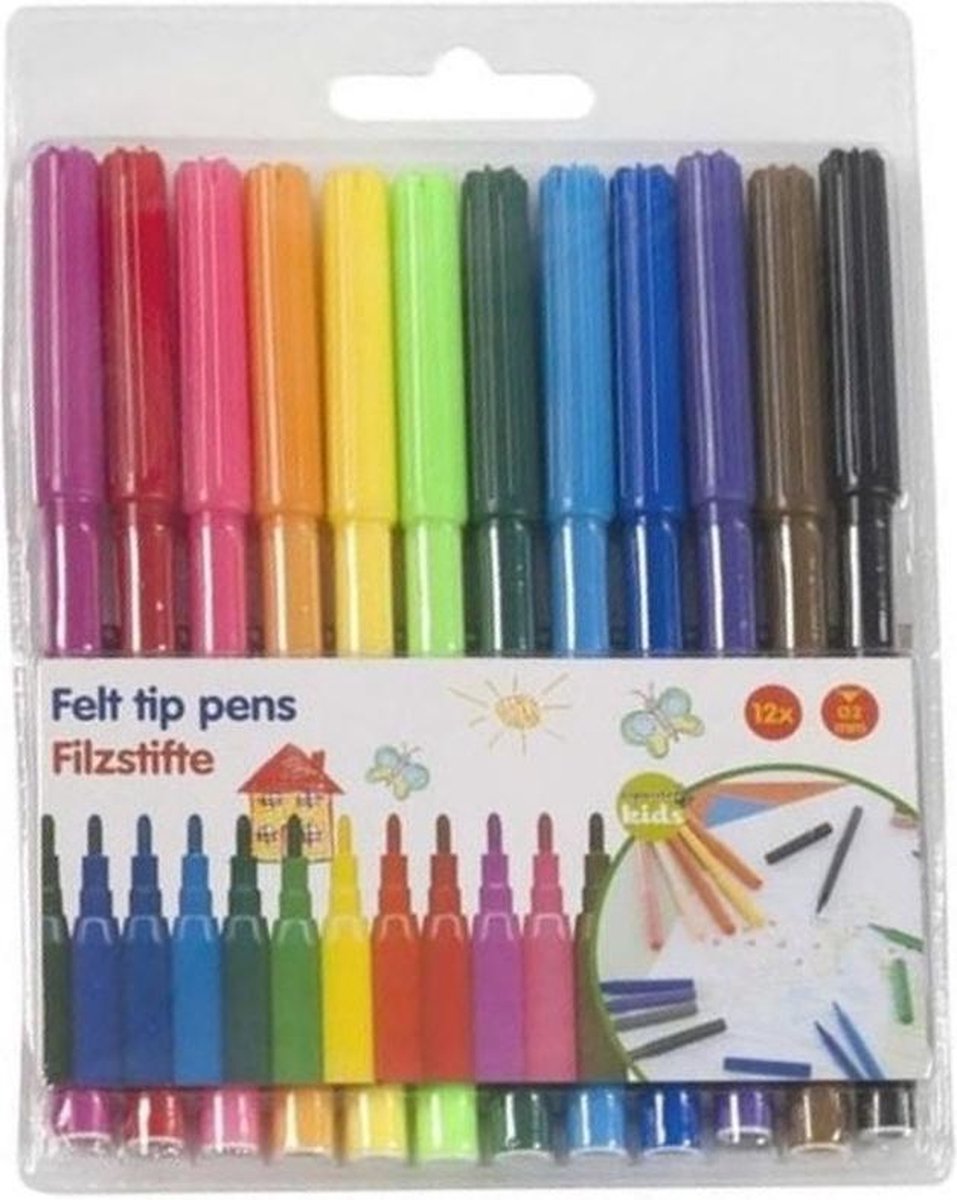 Een set van 12 gekleurde viltstiften met dunne punt. De stiften worden geleverd in een etui. Hoogte stift: ca. 15 cm. Eventuele stiftvlekken zijn te verwijderen bij 40 graden wassen.