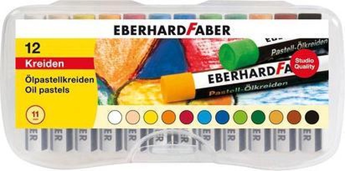Oliepastelkrijt, studio kwaliteit. Zeer intensieve kleuren op alle gladde oppervlakken, watervast, breukvast en het krijt is met papier omwikkelt. Stift van O 11 mm, en 70 mm lang. Verpakt in plastic doosje. 12 stuks.