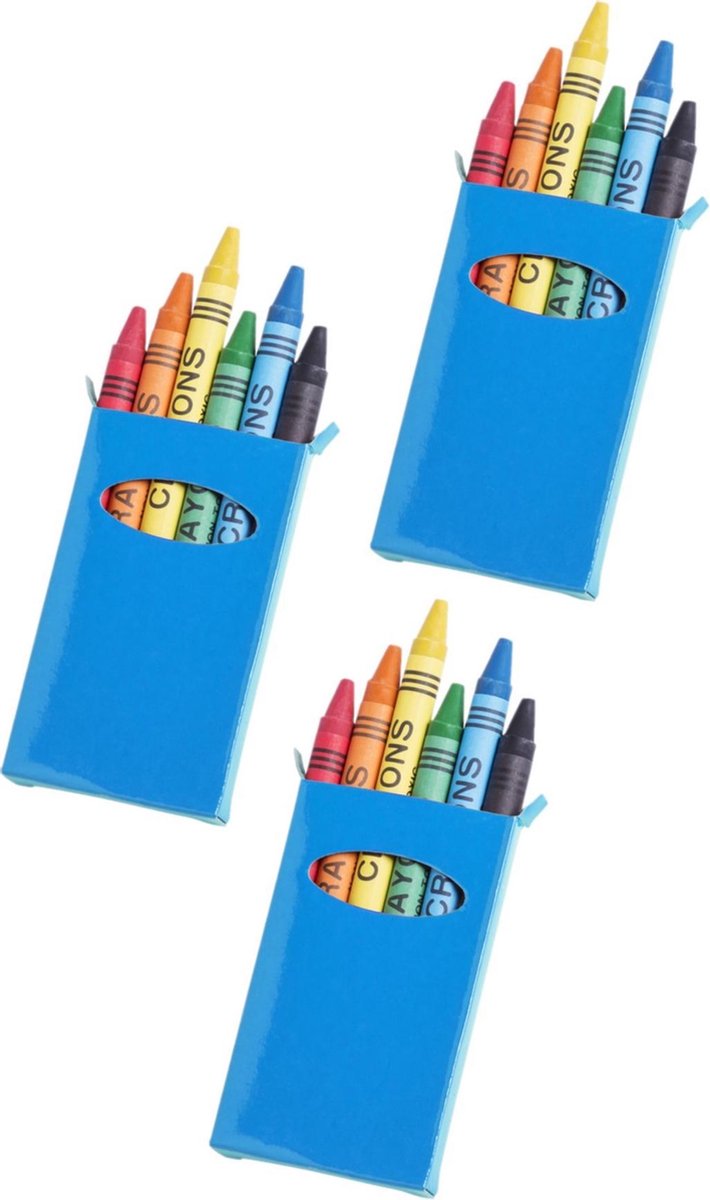 12x pakjes waskrijtjes 6 stuks gekleurd. 6 verschillend gekleurde waskrijtjes in een blauw doosje. Formaat doosje met krijtjes: ongeveer 8 x 5 cm. U ontvangt 12x pakjes met elk 6 gekleurde waskrijtjes.