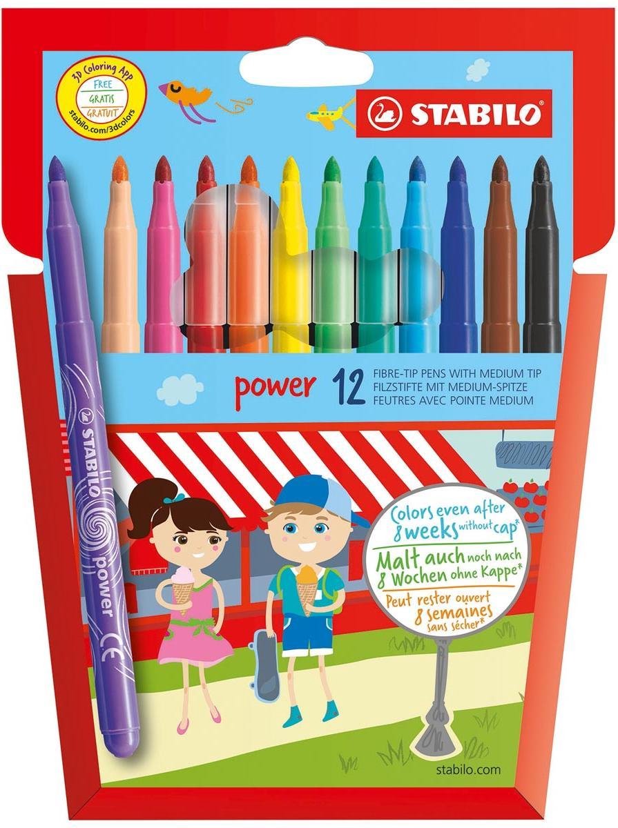 Viltstift met dikke, ronde punt. Ideaal voor het inkleuren van grote vlakken. Droogt niet uit, zelfs niet na weken zonder dop. Heldere kleuren. Afwasbare inkt. Met een geventileerde dop.\\n\\n12 stiften in een kartonnen etui