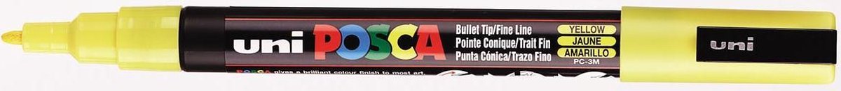 Merkstift op waterbasis en gepigmenteerde inkt. Schrijfbreedte: 1,5 mm. Ideaal om te schilderen, tekenen, schrijven en markeren op elk oppervlak. Met ondoorlatende, heldere kleuren. Dekkend, overschrijfbaar, mengbaar, waterbestendig, constant bij langdurige blootstelling aan licht en reukloos. Geschikt voor alle ondergronden. Permanent op poreuze oppervlakken.\\n\\ngeel