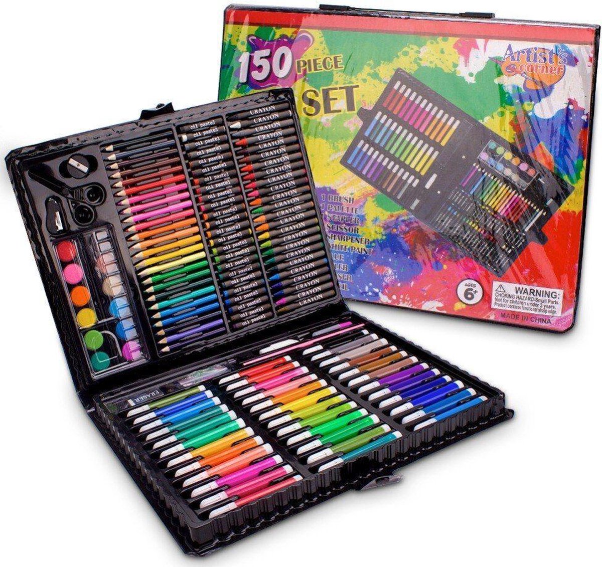 ALLES WAT EEN KLEINE KUNSTENAAR NODIG HEEFT Wek de verbeelding en creatieve vaardigheden van uw kind met de Art Set. De magische koffer bevat alles wat je nodig hebt om te spelen: kleurpotloden, viltstiften, pastels, verf en andere items die nuttig zijn voor artistieke creativiteit: een liniaal, gum, penseel, enz. EEN KIT VOOR ELK KIND (Of Volwassene ) In onze artistieke set is er voor elk wat wils: kleurpennen, kleurpotloden om te tekenen en verf om te schilderen. Dit alles in verzadigde kleuren die er geweldig uitzien op papier. Alles is verpakt in een comfortabele koffer die gemakkelijk kan worden opgevouwen, gesloten en meegenomen - naar school, kleuterschool, kunstlessen of op reis om buiten te schilderen! NIET ALLEEN VOOR KINDEREN De kunstset is niet alleen een aanbieding voor kinderen. Een rijk palet aan kleuren en verschillende soorten gereedschappen zullen goed werken bij het schetsen, kleuren en vele andere werken. Maak de kunstenaar in jou wakker en druk jezelf uit door