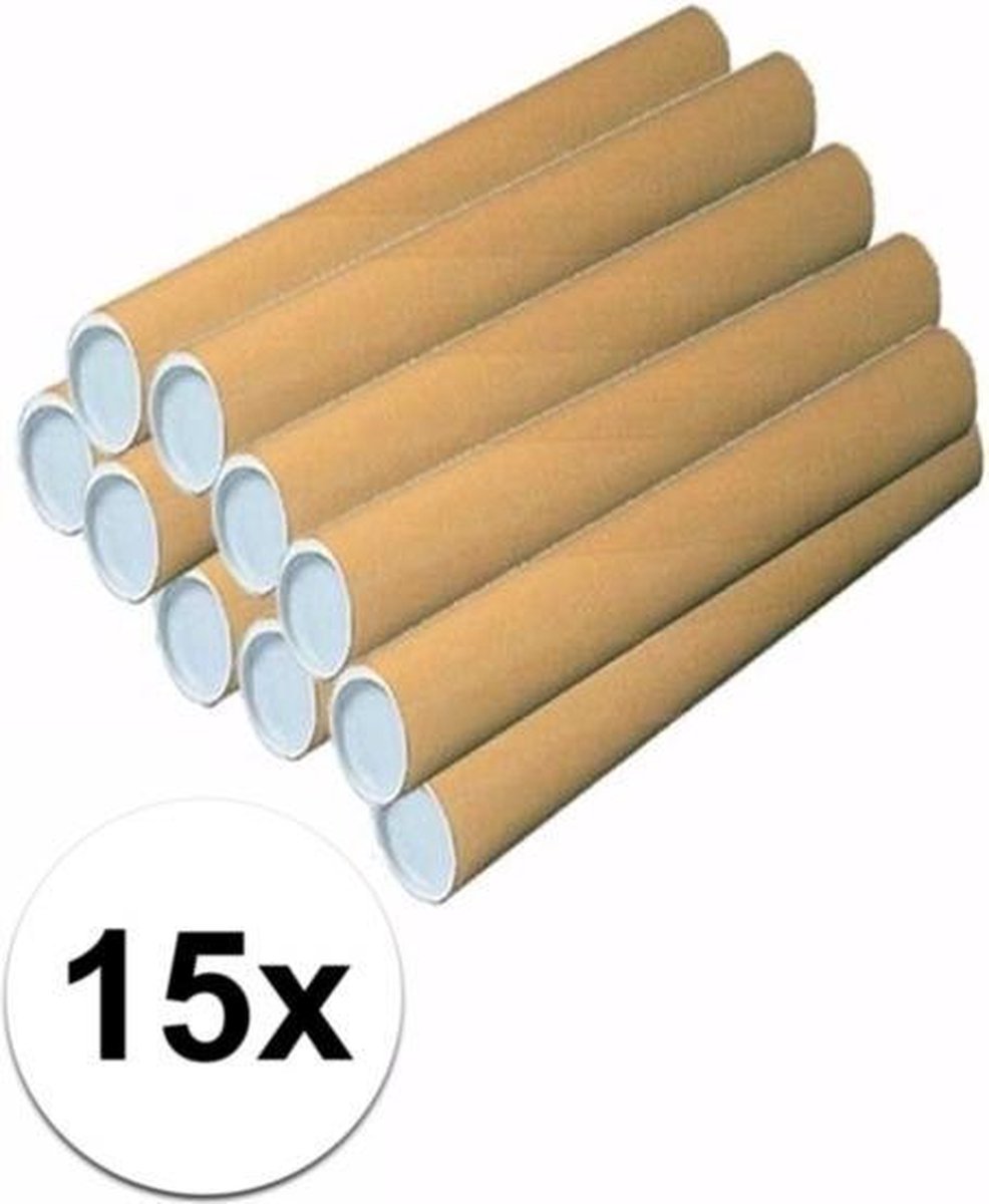 15x Kartonnen poster koker A1. De kokers hebben ieder een afmeting van: 640 x 60 mm. De kokers zijn gemaakt van stevig karton in het bruin. De kokers kunnen worden afgesloten door middel van de bijgeleverde witte dopjes.