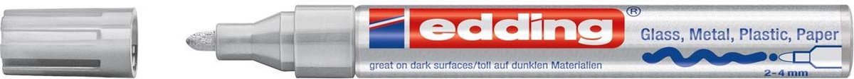 Ronde punt. Schrijfbreedte 2 - 4 mm. Voor het schrijven en markeren op bijna alle materialen, zoals glas, plastic, hout en metaal. Permanente, reukarme, lakachtig dekkende inkt. Hittebestendig tot 400 °C. Voor gebruik goed schudden en pompen.\\n\\nzilver