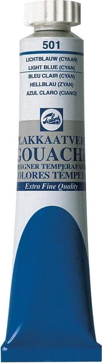 Tube van 20 ml. Dekkende en hoog gepigmenteerde verf met water verdunbaar. Droogt binnen enkele minuten. Ideaal om te schilderen op streeploze en matte oppervlakken. Hecht op iedere vetvrije en poreuze ondergrond zoals papier, karton, maar ook op hout, gips en aardewerk.\\n\\nlichtblauw (cyaan)