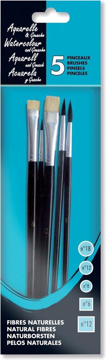 Natuurlijke vezels. Set van 3 ronde penselen (nr 8, 12, 18) in eekhoornhaar en 2 platte penselen (nr 6, 12) in varkenshaar. Korte steel, zwart gelakt.