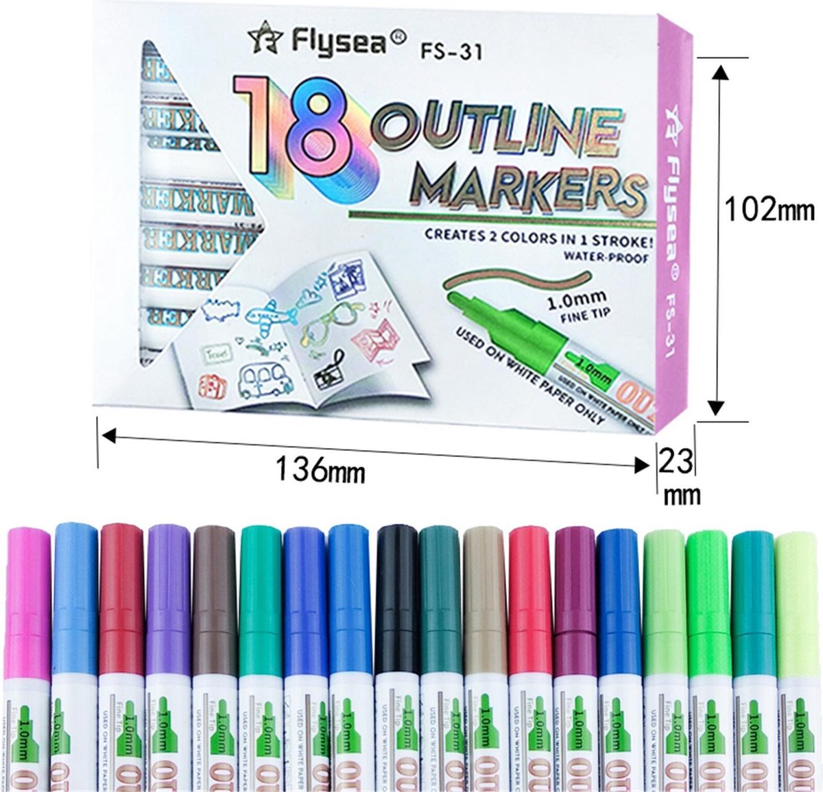 Set van 18 kleuren. Kleur zelf is goud kleur, maar het is omlijnd in de kleur van de pen. Het unieke is dat de pennen echt zichzelf omlijnen, waardoor u een tweekleurig effect kunt creëren Deze ongelooflijke zelf-omlijnde stiften schrijven in een levendig goud, omgeven door gekleurde randen. Deze unieke technologie produceert automatisch contouren met een prachtig tweekleurig effect. Geweldig voor kunst, handwerk, schoolprojecten en meer. Zorg ervoor dat u ze voor verschillende knutselprojecten gebruikt. Ze zijn goed gepigmenteerd, erg vloeibaar, schrijven soepel en zien er magisch uit, zien er prachtig en sprankelend uit. Maak uw verjaardags- en kerstkaarten, kartonnen dozen en fotolijsten nog spannender - wat u ook kiest! Gouden kleur met 18 gave omtrekkleuren. Premium kleurkwaliteit zorgt ervoor dat uw kunstwerk er indrukwekkend uitziet Duurzame 1 MM punt zorgt voor een veegvaste lijn. Hoe te gebruiken: 1: Schud de pen met de punt naar boven iedere keer voor gebruik. 2: De inkt