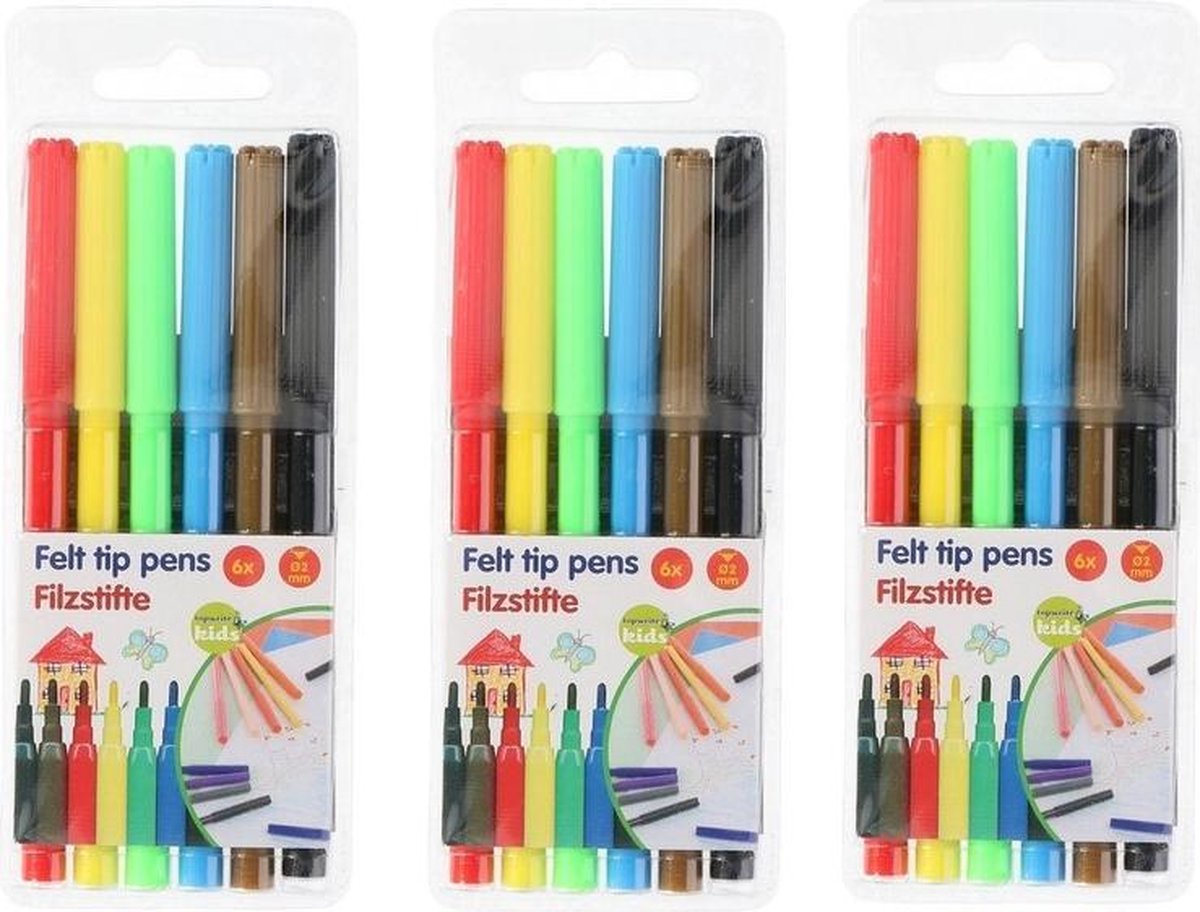 Een set van 18 gekleurde viltstiften met dunne punt. De stiften worden geleverd in een etui. Hoogte stift: ca. 15 cm. Eventuele stiftvlekken zijn te verwijderen bij 40 graden wassen. U ontvangt in totaal 18 viltstiften.