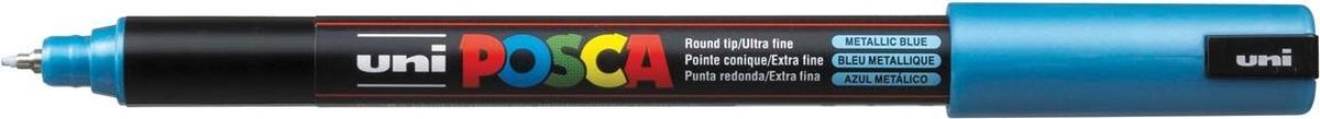 Verfstift op waterbasis, voor elke ondergrond. De Posca verf is ondoorschijnend en dekkend, houdt op poreuze oppervlakken en is makkelijk afwisbaar op glas. Extra fijne in metaal gevatte gekalibreerde punt van 0,7 mm breed. Om te schrijven, te tekenen, teschilderen, te versieren en te markeren. De Posca extra fijn PC-1MR is delicaat, gekalibreerd en in metaal gevat. Hij bezit alle kwaliteiten van een viltstift met verf, in de vorm van een pen. Ontworpen voor al degenen die aan een ultrafijn en ingewikkeldontwerp werken, in een waaier rijk aan kleureffecten.\\n\\nmetaalblauw