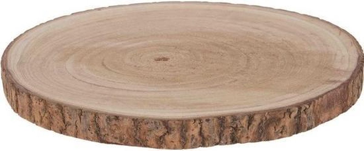 1x Woondecoratie ronde boomschijf 40 cm van Paulowna hout. Ronde houten boomschijf/boomplak van de Paulownaboom. De boomstamschijf kan gebruikt worden als borden of pannen onderzetter, als kaarsenplateau, of ter decoratie met woonaccessoires erop. U kunt de schijf ook zelf decoreren/beschilderen naar wens (materiaal niet inbegrepen). Houten boomschijven/boomstamschijven decoraties. Materiaal: hout. Formaat diameter: ca. 40 cm, hoogte/dikte: ca. 3 cm. Dit product betreft een natuurproduct en kan daardoor afwijken van de afbeelding en de bovengenoemde afmetingen.