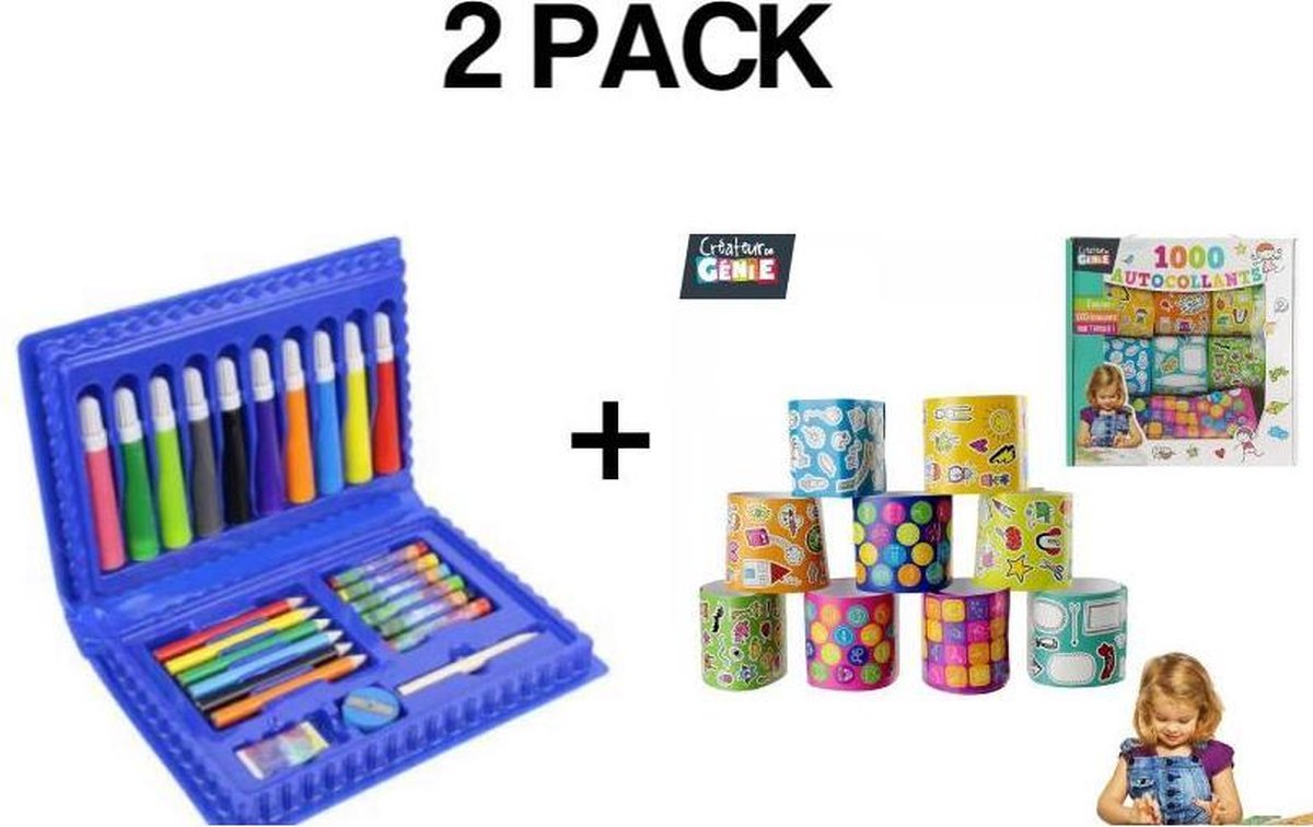 2-PACK MINI TEKENSET EN MINI STICKERSET! TEKENSET: Dit schattige 25-delig mini kleurendoosje is ideaal en geeft creatief plezier voor uw kinderen. Inhoud: 10 stiften 6 pastels 6 kleurpotloden 1 potlood 1 puntenslijper 1 gum Afmetingen: 14.3x3.2x21.6 cm Met geïntegreerde handgreep voor gemakkelijk transport. STICKERSET: Deze set van 1000 mini stickers met 9 rollen met verschillende thema's voor school, vakantie, uitje, dieren, speelgoed, symbolen, prinsessen, uitstapjes, emoticons is perfect om je kinderen te vermaken en hun creativiteit te ontwikkelen.