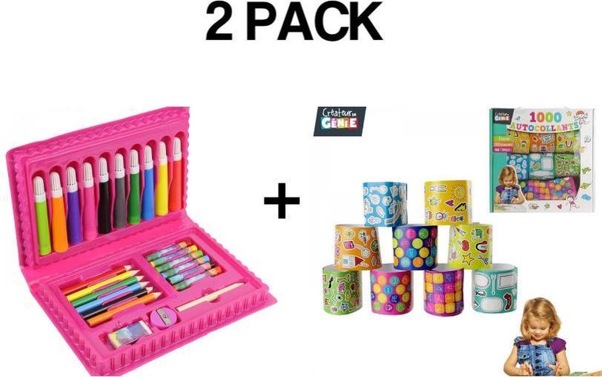 2-PACK MINI TEKENSET EN MINI STICKERSET! TEKENSET: Dit schattige 25-delig mini kleurendoosje is ideaal en geeft creatief plezier voor uw kinderen. Inhoud: 10 stiften 6 pastels 6 kleurpotloden 1 potlood 1 puntenslijper 1 gum Afmetingen: 14.3x3.2x21.6 cm Met geïntegreerde handgreep voor gemakkelijk transport. STICKERSET: Deze set van 1000 mini stickers met 9 rollen met verschillende thema's voor school, vakantie, uitje, dieren, speelgoed, symbolen, prinsessen, uitstapjes, emoticons is perfect om je kinderen te vermaken en hun creativiteit te ontwikkelen.