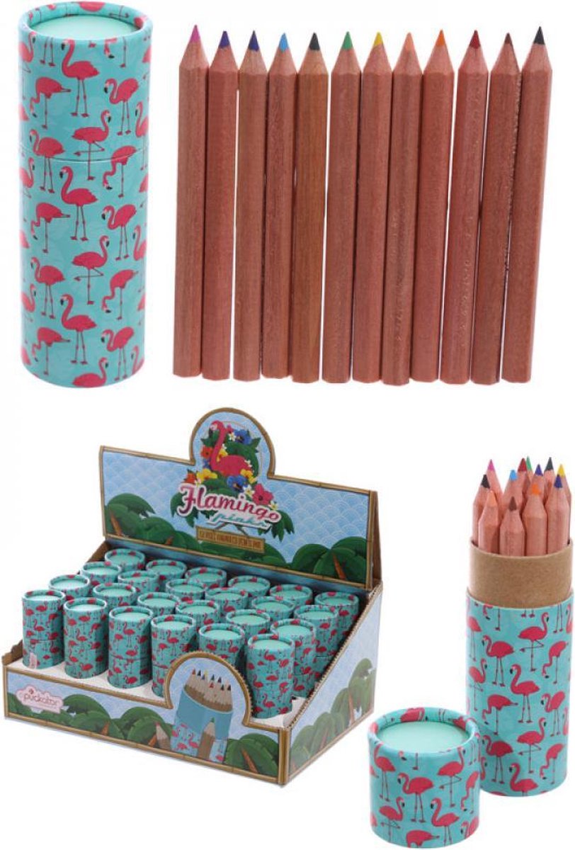 2 stuks ronde buisjes Flamingo met 12 kleurpotloden = 24 kleurpotloden Lengte buis 10 cm - breed 3,5 cm