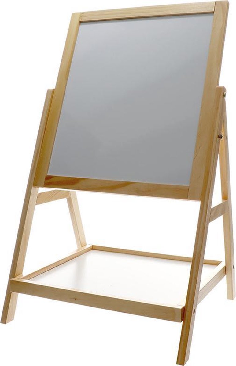 Kwalitatief en handig schoolbord 1 zijde magnetisch whiteboard 1 zijde krijtbord Beleef uenlang plezier met dit handige schoolbord. Eenvoudig omklapbaar en gezekerd met 2 schroefjes. Op het legplankje kan je al je spulletjes kwijt. Afmetingen: whiteboard en krijtbord: (30x35)cm totale almetingen: (70x40)cm