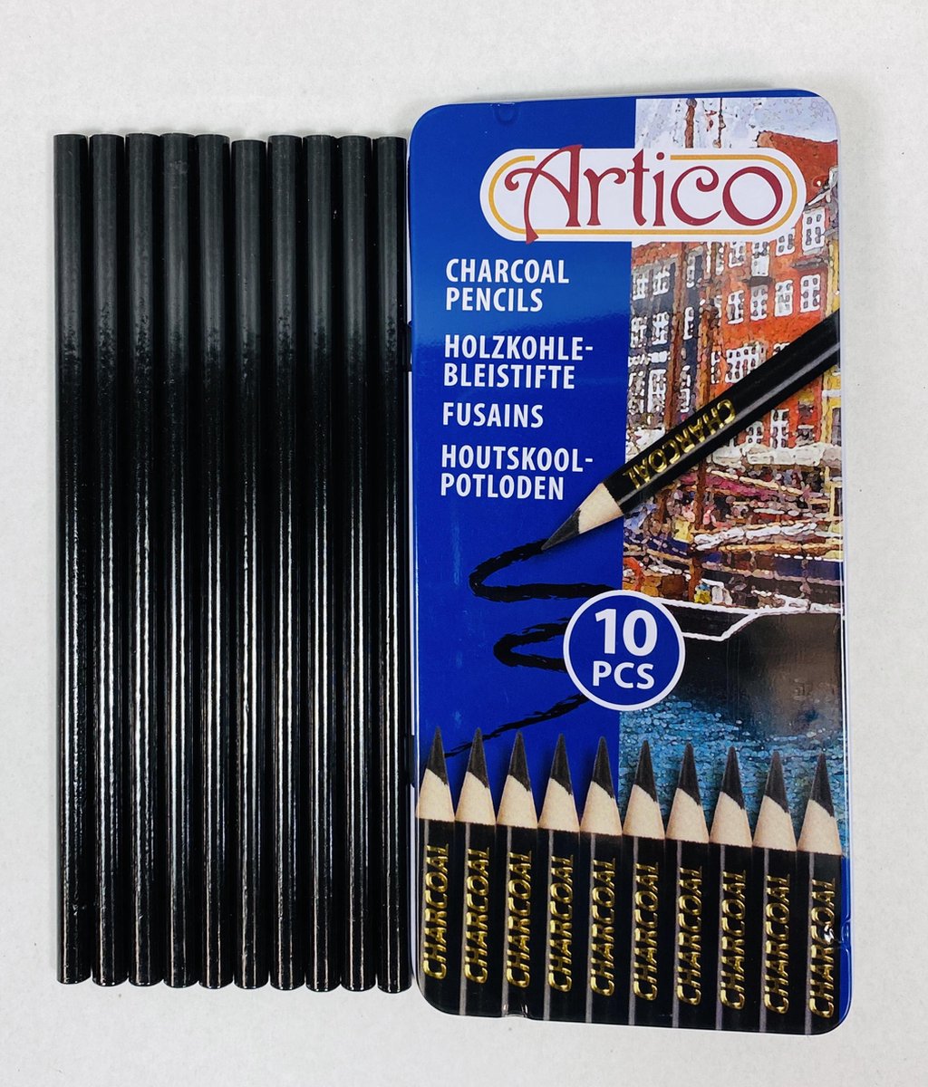 20 stuks houtskoolpotloden. Verpakt in 2 aparte meeneemblikken (10 stuks per blik) Puntenslijper is niet inbegrepen