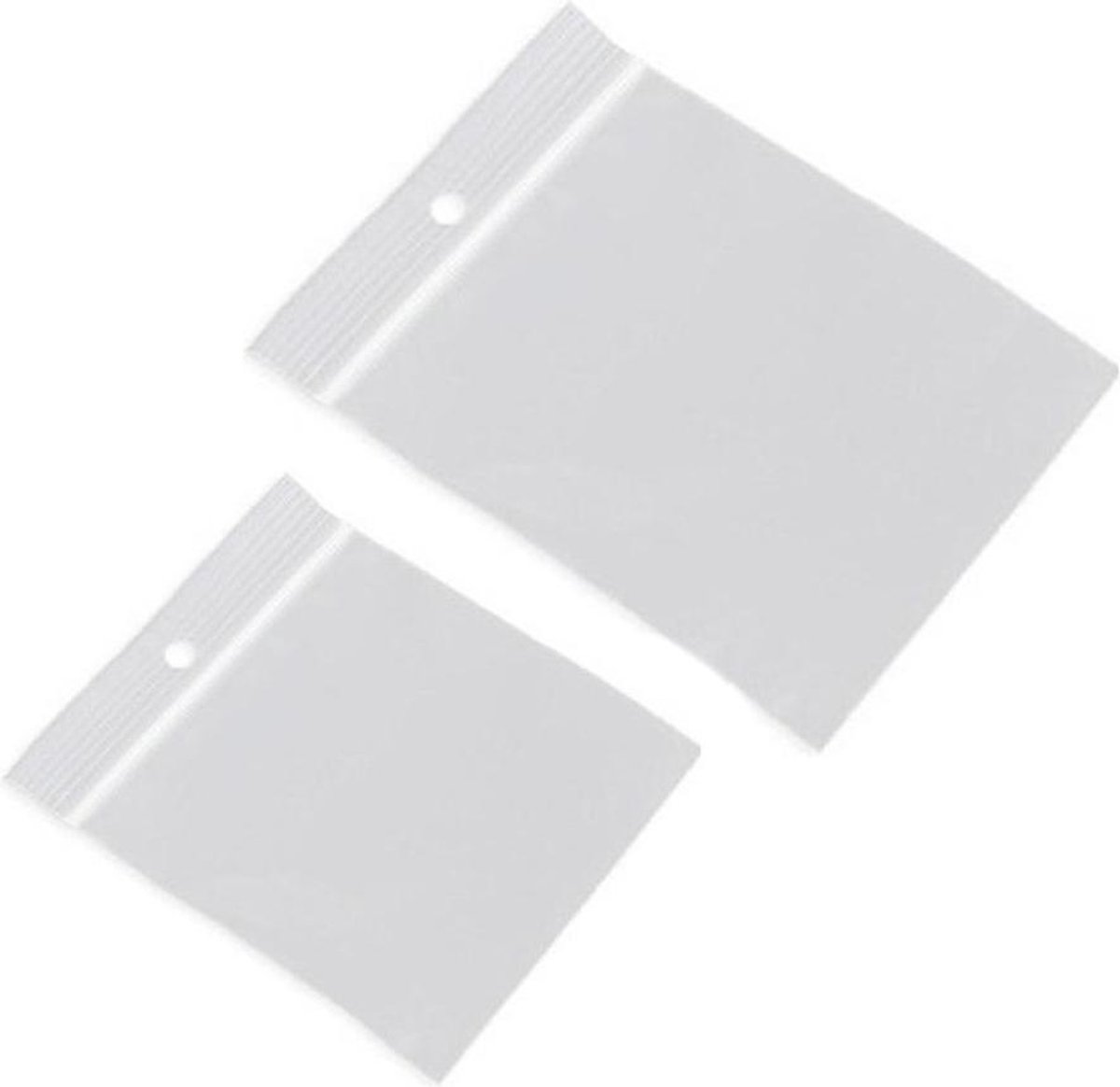 200x Gripzakjes/verpakkingszakjes 40 x 40 mm en 55 x 65 mm. Plastic hersluitbare verpakkingszakjes met gripsluiting/druksluiting, in twee formaten. Aantal zakjes: 200x, verdeeld over 100 stuks 40 x 40 mm en 100 stuks 55 x 65 mm. Formaat: 40 x 40 mm (4 x 4 cm) en 55 x 65 mm (5,5 x 6,5 cm). Ophanggaatje: 5 mm rond ponsgat. Kleur: transparant met witte streep. Materiaal: LDPE (lagedichtheidpolyetheen, een soort plastic/kunststof). Dikte: 50 micron. U kunt, indien gewenst, met een watervaste stift/markeerstift iets op het zakje schrijven. De tekst wel even afdeppen/laten drogen zodat de stift niet meer afgeeft. Handige plastic verpakkingsmateriaal zakjes voor hobbyprojecten of voor het bewaren van kruiden, kraaltjes, muntjes, schroefjes, pluggen of andere kleine producten. Ook uitermate geschikt voor het presenteren of verzenden van kleine onderdelen/producten. bestaande uit 1x 100x Gripzakjes/verpakkingszakjes 40 x 40 mm/4 x 4 cm, 1x 100x Gripzakjes/verpakkingszakjes 55 x 65 mm/5 x 6 cm