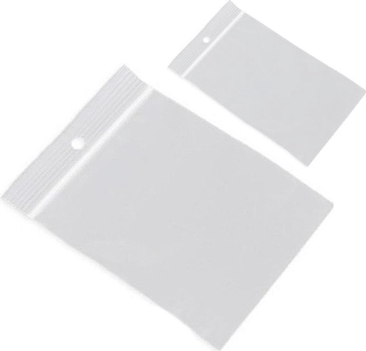 200x Gripzakjes/verpakkingszakjes 40 x 60 mm en 90 x 100 mm. Plastic hersluitbare verpakkingszakjes met gripsluiting/druksluiting, in twee formaten. Aantal zakjes: 200x, verdeeld over 100 stuks 40 x 60 mm en 100 stuks 90 x 100 mm. Formaat: 40 x 60 mm (4 x 6 cm) en 90 x 100 mm (9 x 10 cm). Ophanggaatje: 5 mm rond ponsgat. Kleur: transparant met witte streep. Materiaal: LDPE (lagedichtheidpolyetheen, een soort plastic/kunststof). Dikte: 50 micron. U kunt, indien gewenst, met een watervaste stift/markeerstift iets op het zakje schrijven. De tekst wel even afdeppen/laten drogen zodat de stift niet meer afgeeft. Handige plastic verpakkingsmateriaal zakjes voor hobbyprojecten of voor het bewaren van kruiden, kraaltjes, muntjes, schroefjes, pluggen of andere kleine producten. Ook uitermate geschikt voor het presenteren of verzenden van kleine onderdelen/producten. bestaande uit 1x 100x Gripzakjes/verpakkingszakjes 90 x 100 mm/9 x 10 cm, 1x 100x Gripzakjes/verpakkingszakjes 100 x 100 mm/10 x