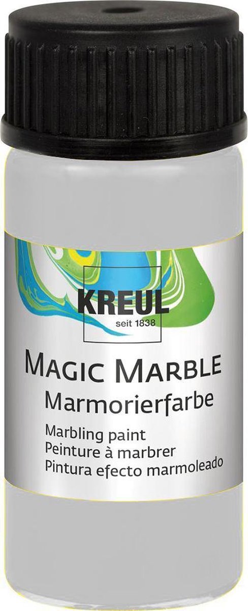 Deze Magic Marble verf van Kreul Hobby Line voorziet elk oppervlak van een uniek marble effect. De toepassingen zijn eindeloos, van gitaren, tot achtergronden van schilderijen. Deze verf is geschikt voor diverse ondergronden zoals hout, karton, metaal, porcelein, kaarsen, etc. Eigenschappen: - droogt snel - matte afwerking - hersluitbaar glazen potje van 20ml - 17 kleurtinten Hoe werkt het? De verf wordt vanuit het potje in een waterbad gedruppeld, eventjes doorroeren, het voorwerp onderdompelen en klaar is kees! Magic Marble is verkrijgbaar in meer dan 30 schitterende kleuren, waaronder ook 2 glittertinten, 4 metallic kleuren, 3 neon kleuren en 4 matte tinten. Verkrijgbaar in glazen potjes van 20 ml met druppelinzet voor eenvoudig en nauwkeurig werken.