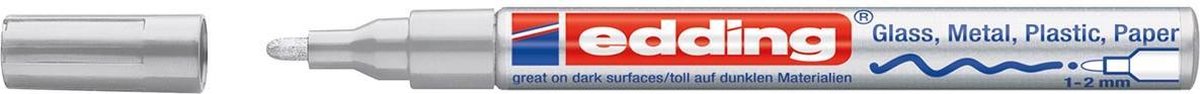 Lakmarker met ronde punt. Schrijfbreedte: 1 - 2 mm. Voor het schrijven en markeren op bijna alle materialen zoals glas, plastic, hout en metaal. Permanente, reukarme, hittebestendige en lakachtige dekkende inkt. Voor gebruik goed schudden en pompen.\\n\\nzilver
