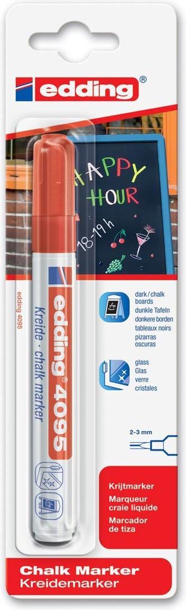Ronde punt. Schrijfbreedte: 2 - 3 mm. Geurneutraal krijt op waterbasis. Voor het beschrijven van o.a. ramen en krijtborden. Met een vochtige doek te verwijderen van bijna alle niet-poreuze oppervlakken.\\n\\nrood, op blister