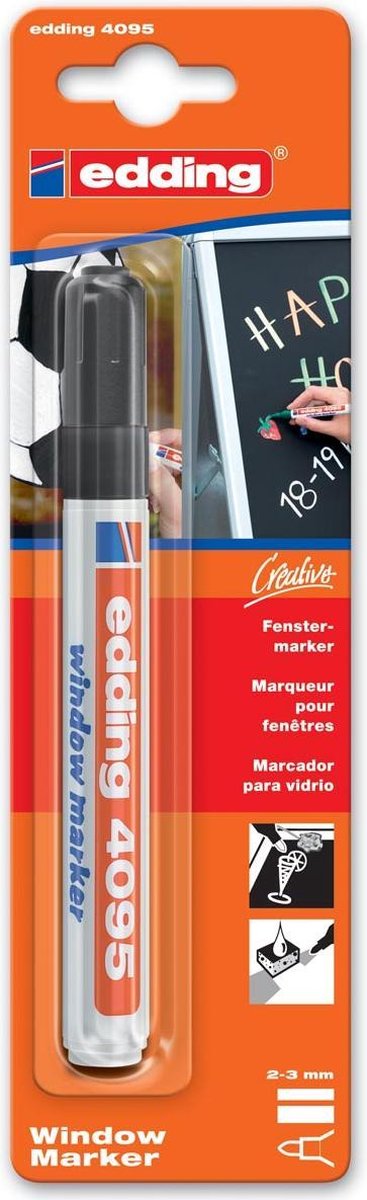 Ronde punt. Schrijfbreedte: 2 - 3 mm. Geurneutraal krijt op waterbasis. Voor het beschrijven van o.a. ramen en krijtborden. Met een vochtige doek te verwijderen van bijna alle niet-poreuze oppervlakken.\\n\\nzwart (1 stuk op blister)