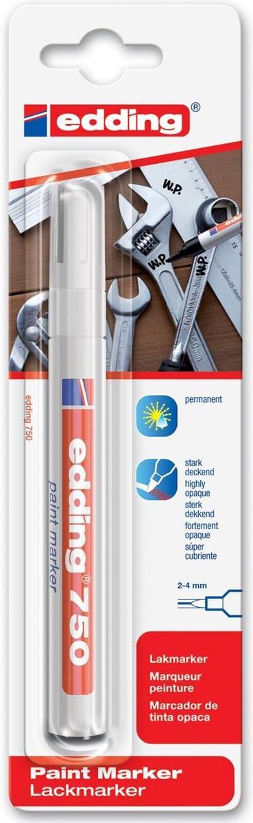 Lakmarker met ronde punt. Schrijfbreedte: 2 - 4 mm. Voor het schrijven en markeren op bijna alle materialen, zoals glas, plastic, hout en metaal. Permanente, reukarme, lakachtig dekkende inkt. Hittebestendig tot 400 °C. Voor gebruik goed schudden en pompen.\\n\\nwit, op blister