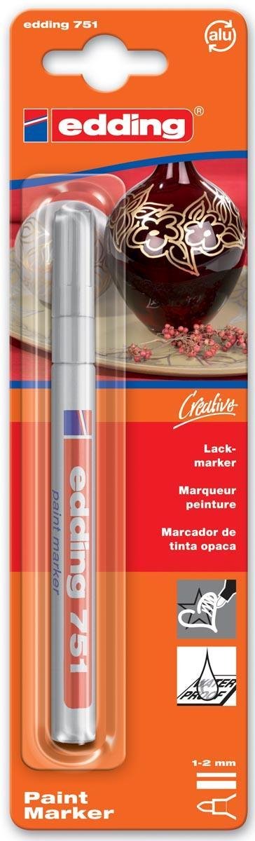 Lakmarker met ronde punt. Schrijfbreedte: 1 - 2 mm. Voor het schrijven en markeren op bijna alle materialen zoals glas, plastic, hout en metaal. Permanente, reukarme, hittebestendige en lakachtige dekkende inkt. Voor gebruik goed schudden en pompen.\\n\\nzilver, op blister