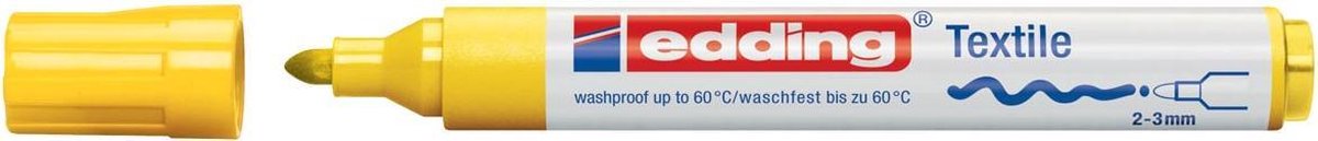 Met ronde punt. Schrijfbreedte: 2 - 3 mm. Lichtbestendige, reukneutrale pigmentinkt op waterbasis. Voor het beschrijven en decoreren van bijna alle textielsoorten. Na het fixeren wasbestendig tot 60 °C.\\n\\ngeel