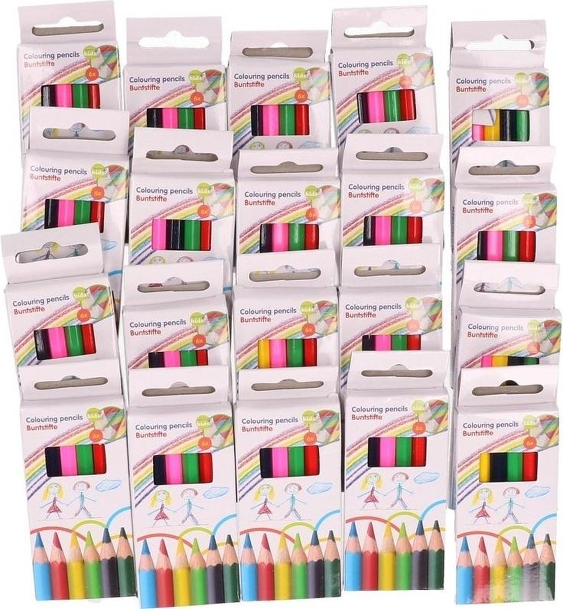 20 Pakjes mini houten kleurpotloden in doosje van 6 stuks in verschillende kleuren. Type: HB. Lengte: 8,5 cm. Ook leuk als weggevertje bij een kinderfeestje, of als klein schoencadeautje. U ontvangt 20 doosjes met 6 potloden.