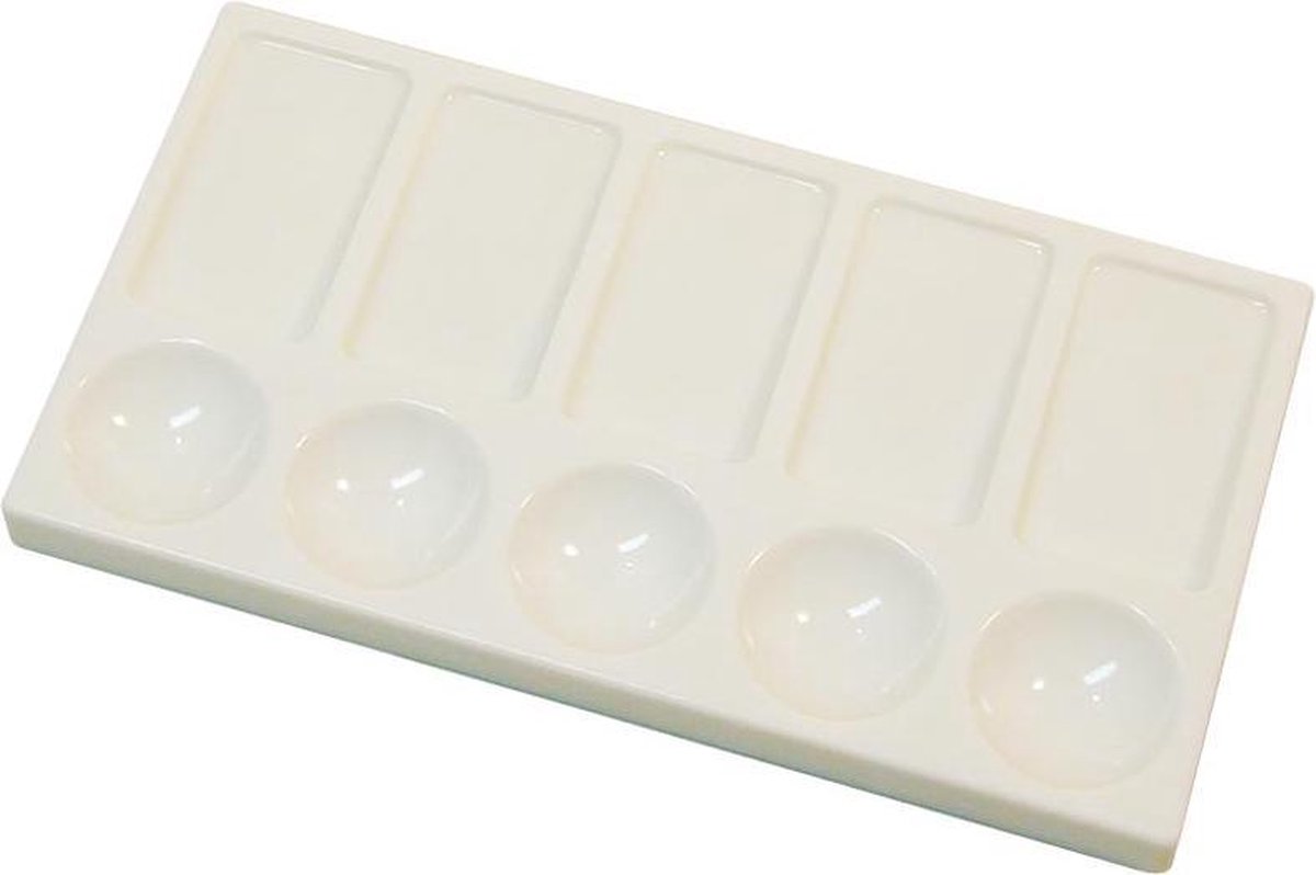 Een rechthoekige plastic mengschaal met 5 ronde en 5 rechthoekige mengvakjes. Ft 10,5 x 19,5 cm.