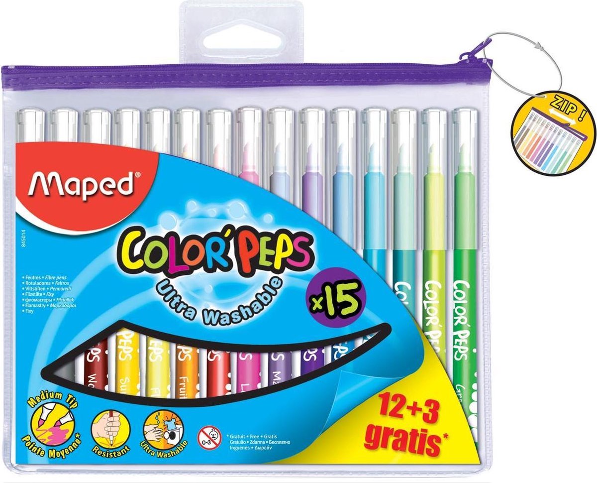 Medium punt, afgeschuinde vorm: voor fijne lijnen en grote kleurvlakken. Ergonomisch: driehoekige grip. Uitwasbare inkt. Geventileerde dop. In een plastic etui.\\n\\n12 + 3 stiften