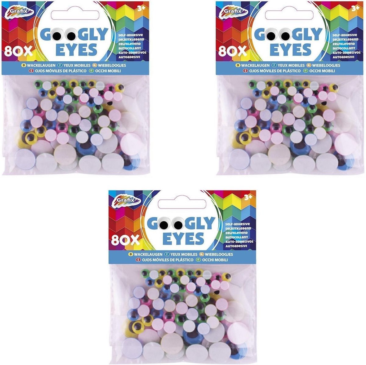 240x Wiebel oogjes gekleurd 5 / 8 / 15 mm. Zelfklevende wiebel oogjes in verschillende kleuren en formaten om bijvoorbeeld mee te knutselen. De oogjes zijn zelfklevend en er zitten ongeveer 80 stuks in het zakje. Kleuren: blauw, geel, groen, roze. Diameter oogjes: 5 mm, 8 mm en 15 mm. Materiaal: kunststof. U ontvangt 3 zakjes. Merk: Grafix. Wiebeloogjes/decoratie oogjes hobbymateriaal/knutselmateriaal. Grappige wiebelende oogjes om ergens op te plakken.