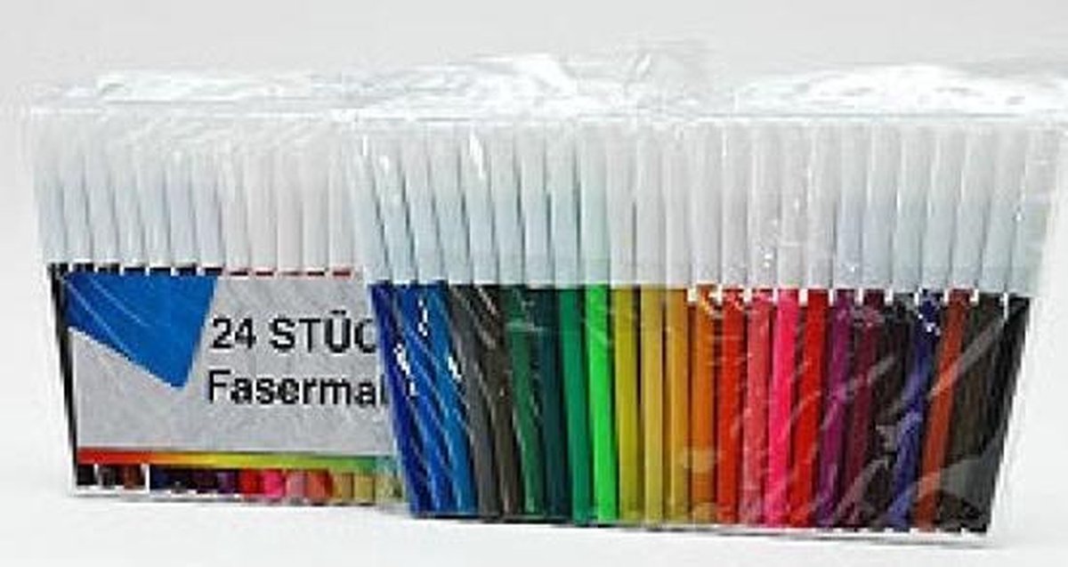 Een set van 24 gekleurde viltstiften met dunne punt. Eventuele stiftvlekken zijn te verwijderen bij 40 graden wassen. Kleuren creatief speelgoed voor kinderen.