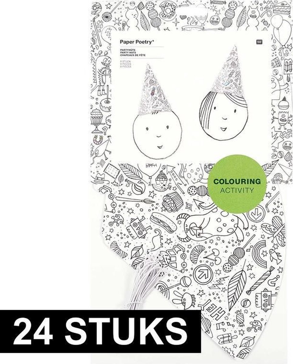 Een set van 24 papieren feesthoedjes/partyhoedjes (250 grams), om zelf in te kleuren. Opdrukken van o.a. insecten, aliens en snoepjes. De afbeeldingen varieren van 1 tot 5 cm. Afmeting hoedje: D13 x H20 cm. U ontvangt 3 pakjes met 8 stuks. Leuk om kinderen mee te laten knutselen op een kinderfeestje/verjaardagspartijtje! Hobbymateriaal/knutselmateriaal diy feesthoedjes/partyhoedjes kleuren voor kinderen/jongens/meisjes.