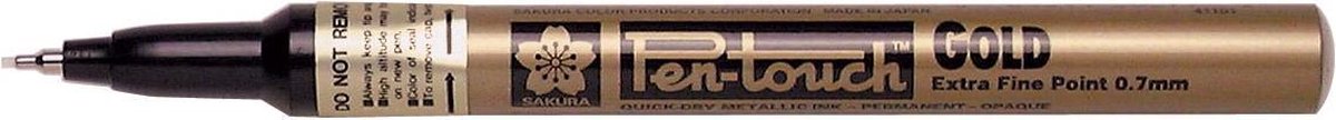Speciaal ontwikkeld voor decoratieve toepassingen. De inkt bevat enige alcohol en biedt in combinatie met de speciale metallic pigmenten een veilig, dekkend, sneldrogend metaalachtig resultaat. De permanente inkt is watervast, lichtbestendig en bestand tegen chemicaliën. Toepasbaar op vele papiersoorten en niet-poreuze oppervlakken.\\n\\npunt van 0,7 mm, goud