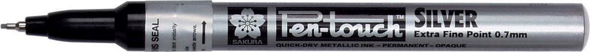 Speciaal ontwikkeld voor decoratieve toepassingen. De inkt bevat enige alcohol en biedt in combinatie met de speciale metallic pigmenten een veilig, dekkend, sneldrogend metaalachtig resultaat. De permanente inkt is watervast, lichtbestendig en bestand tegen chemicaliën. Toepasbaar op vele papiersoorten en niet-poreuze oppervlakken.\\n\\npunt van 0,7 mm, zilver