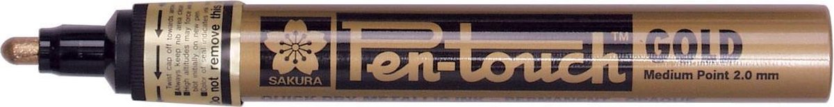Speciaal ontwikkeld voor decoratieve toepassingen. De inkt bevat enige alcohol en biedt in combinatie met de speciale metallic pigmenten een veilig, dekkend, sneldrogend metaalachtig resultaat. De permanente inkt is watervast, lichtbestendig en bestand tegen chemicaliën. Toepasbaar op vele papiersoorten en niet-poreuze oppervlakken.\\n\\npunt van 2 mm, goud