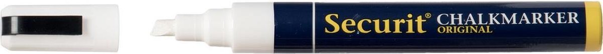 Securit originele krijtmarker met medium schuine punt van 2-6 mm. Deze krijtmarker loopt niet uit, verkleurt niet en is bestand tegen lichte regen. Te gebruiken op alle niet-poreuze oppervlakken. Afwasbaar met spons en water.\\n\\nwit