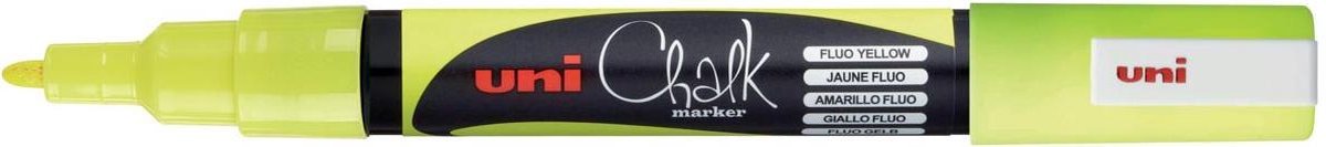 Regenbestendige krijtmarker voor gebruik zowel binnen- als buitenshuis. Uitwisbaar met een vochtige doek van bijna alle niet-poreuze oppervlakken. Ideaal voor menu's, krijtborden, lichtborden en ramen. Heldere kleuren.\\n\\nfluo geel, ronde punt van 0,9-1,3 mm